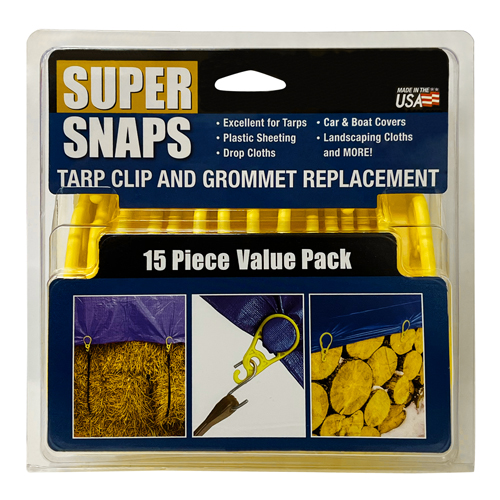 Super Snaps Tarp Clip and Grommet Replacement are ideal for securing tarps and can be placed anywhere on the tarp. Excellent for many uses including repairing tarps and an ideal grommet replacement. Designed to withstand the outdoor elements, Super Snaps are great for the home, marine, ranch, camping, and more!